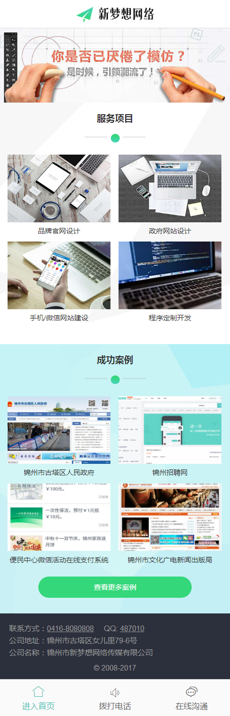 錦州市新夢想網(wǎng)絡傳媒有限公司成立于2008年,是立足于錦州的專業(yè)互聯(lián)網(wǎng)服務提供商,也是覆蓋遼西五市的互聯(lián)網(wǎng)企業(yè)。致力于為事業(yè)單位、政府機關、企業(yè)提供網(wǎng)站建設、微信平臺搭建、軟件開發(fā)和企業(yè)大型商務活動的策劃等服務。